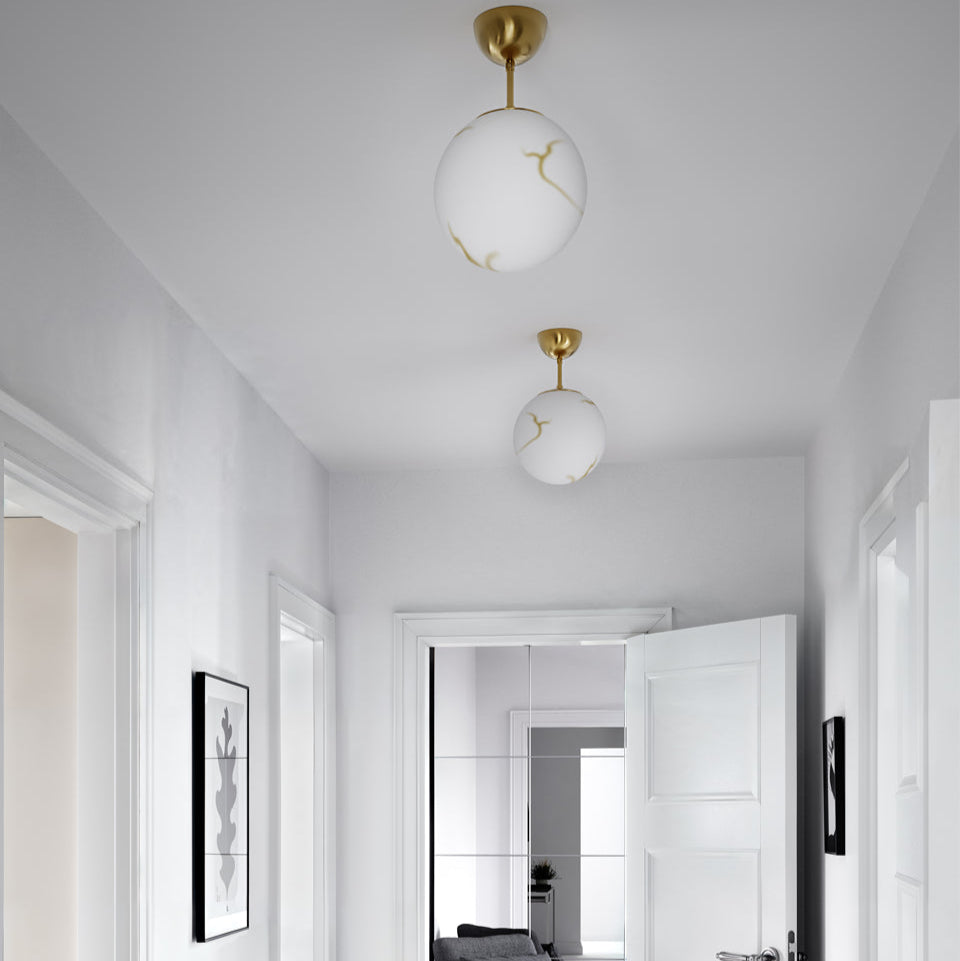 Bellagio är en elegant plafond med tydlig retrokänsla, designad för att ge både stil och funktion till ditt hem. Lampan består av ett vackert marmorerat glas med en diameter på 25 cm, vilket ger ett mjukt och behagligt ljus. Glasets unika mönstring tillsammans med mässingsdetaljerna skapar en tidlös look som passar lika bra i moderna hem som i mer klassiska miljöer.