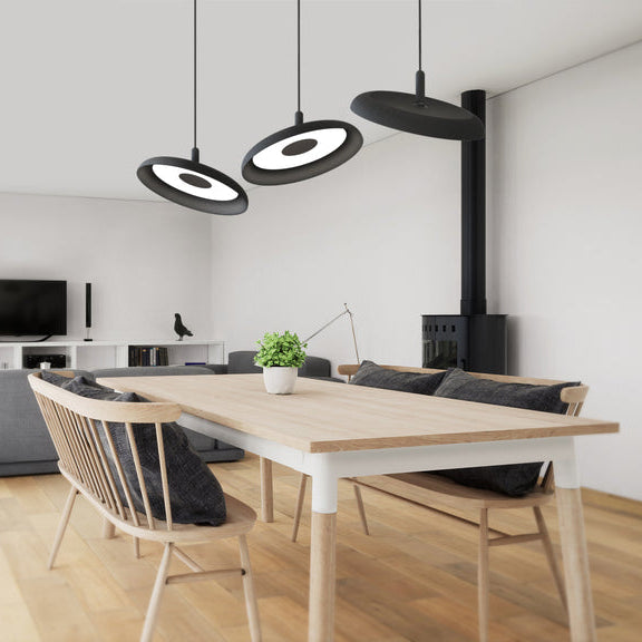 Nivél Pendant Story, omdefiniera framtiden för pendelbelysning, Nivéls rena och eleganta silhuett har en färgglad palett av snurrade skuggaformer kombinerat med en artikulerande platt panel LED-ljuskälla som svänger graciöst på axeln för att fokusera ljuset nedåt eller som en väggtvätt för att ge sömlös ljuskontroll för vilket utrymme som helst. Nivél-pendeln kan hängas individuellt eller i stora flerljusklyftor som drivs av en enda hårdkopplad takplatta som gör att användaren kan omplacera ljusen till önskad höjd, spännvidd och riktning. Finns i 2 storlekar: 15” (38 cm) och 22” (56 cm) och 6 pulverlackade ytor i matt vitt, terrakotta, skogsgrön, skifferblå, espresso och texturerad svart med val av grafit- eller vit tygsladd och takplatta. Nivél finns också i flush-mount-varianter i vitt för båda storlekarna.