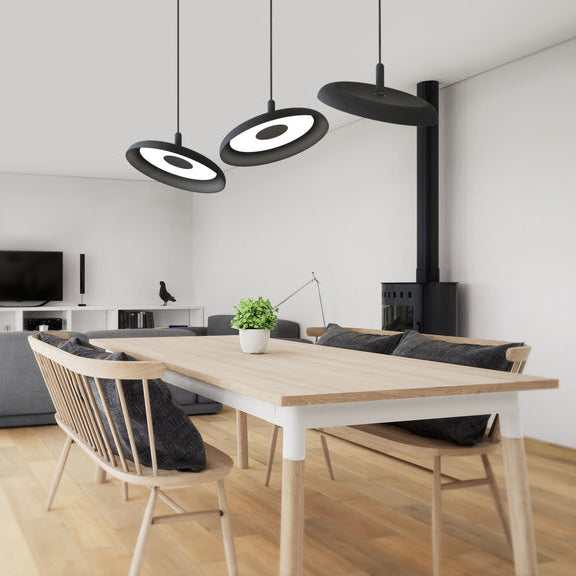 Nivél Pendant Story, omdefiniera framtiden för pendelbelysning, Nivéls rena och eleganta silhuett har en färgglad palett av snurrade skuggaformer kombinerat med en artikulerande platt panel LED-ljuskälla som svänger graciöst på axeln för att fokusera ljuset nedåt eller som en väggtvätt för att ge sömlös ljuskontroll för vilket utrymme som helst. Nivél-pendeln kan hängas individuellt eller i stora flerljusklyftor som drivs av en enda hårdkopplad takplatta som gör att användaren kan omplacera ljusen till önskad höjd, spännvidd och riktning. Finns i 2 storlekar: 15” (38 cm) och 22” (56 cm) och 6 pulverlackade ytor i matt vitt, terrakotta, skogsgrön, skifferblå, espresso och texturerad svart med val av grafit- eller vit tygsladd och takplatta. Nivél finns också i flush-mount-varianter i vitt för båda storlekarna.